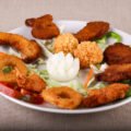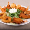 4 breaded shrimp, 6 calamari ring, 4 tempura balls, 4 fish fingers, 2 fish filet.